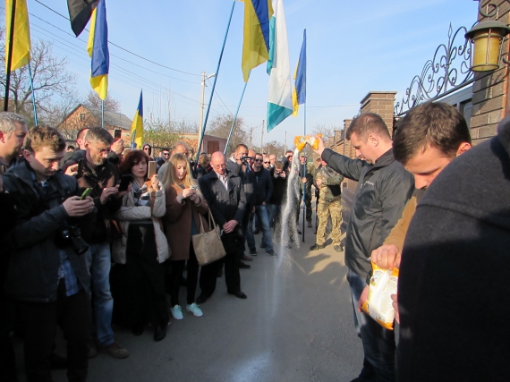 На конец митинга возле дома мэра рассыпали три пакета сахара. Потому что во время выборов городской голова раздавал горожанам продуктовые наборы от партии "Совесть Украины".