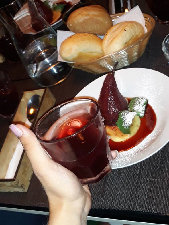 "На самом деле я не знал, что этот десерт чей-то любимый. Об этом сказали посетители заведения. Это идеальный летний десерт, особенно во время сезона груш. Для него грушу проваривают в вине со спеціами и фруктами. Если груши мягкие, варить 15-20 минут. Твердые груши можно и час варить. Далее вытащить серцевинку и полить сливочным заварным кремом. Также подаю их с тем вином, в котором они варились"