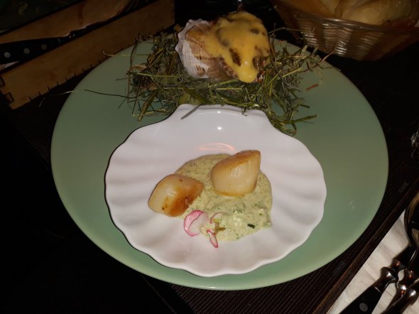 На останнок приносят рапаны с сыром и гребешки в креветочном соусе.