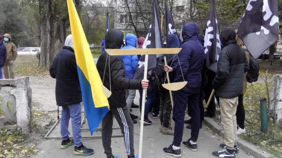Националисты в масках встречали мэра Харькова Геннадия Кренеса под стенами Киевского районного суда в Полтаве. Кричали "Позор!" и держали плакаты.