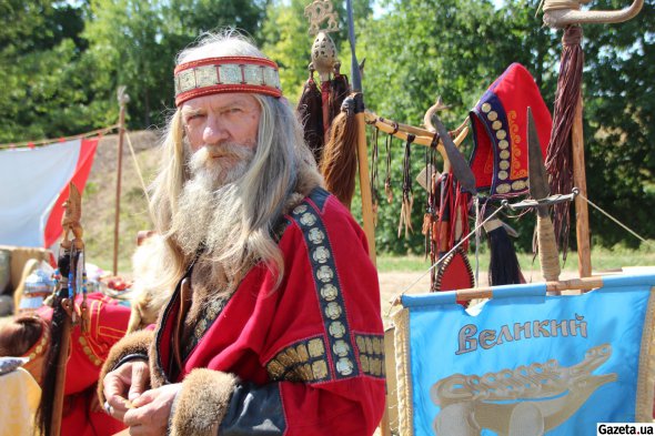 - Какой же Гелон-фест без скифов! Представляем реконструкцию скифов Северного Причерноморья, так называемых сколотов. Информация - ископаемая, это копии находок из курганов. Например, бляшки, которыми украшен мой костюм, созданные по эскизам находок из кургана Куль-Оба. Одежда из льняной ткани. Из украшений - гривне. Наши скифы предпочитали украшениям, изображающие Котовых - львов, пантер, а также грифонов. Это статусные вещи, их носили простые скифы, - говорит участник общества реконструкторов Виталий Кушнир из Запорожья.