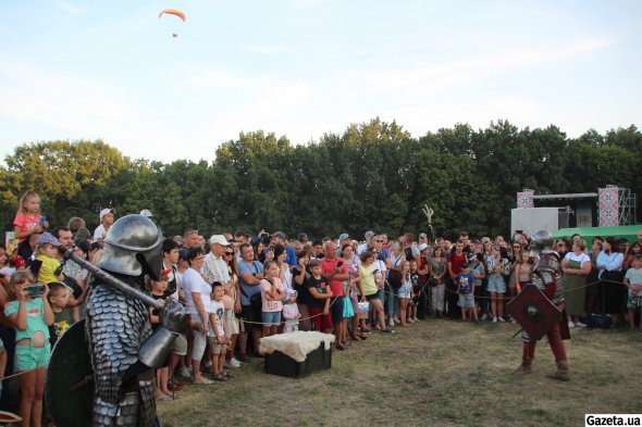 Еще одна группа реконструкторов - "Возрождение" - проводит показательные бои. Реконструируют средневековья. Посмотреть на поединки рыцарей собирается несколько сотен человек.