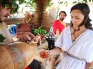 В домике Диониса и Геродота всех желающих угощают виноградными винами производства местных фермеров. Дионис с бокалом произносит тосты за здоровье гостей фестиваля, а его помощницы - вакханки - наливают белое, красное вино или безалкогольный медовый напиток. Туристы приятно удивляются, что аттракция - бесплатно.