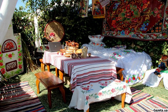 Фотозоне представляют скифское жилье и украинский дом. "Котелевщины от скифов - до современности", под таким девизом действует городок.