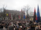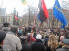 Впереди митинга красно-черные флаги и синий флаги с надписью "За Украину". Флаги с партийной символикой "Свободы" - позади площади. Хотя в анонсах говорилось, что будет всенародное вече, на площади перед памятником собралось 200 человек, преимущественно мужчины-пенсионеры.