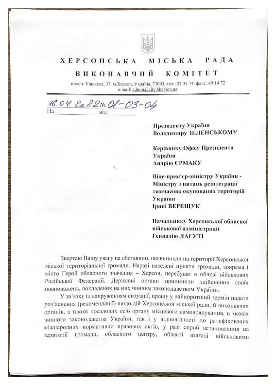 "Прошу в кратчайшие сроки предоставить разъяснение/рекомендации относительно действий Херсонского горсовета в случае попыток установления на территории громады, облцентра, области военными подразделениями РФ власти агрессора, смены флага, введения "рублевой зоны", - призвал городской голова.