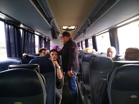 На автовокзале на пустой перрон прибывает междугородный автобус Харьков Киев. Его встречает лично председатель Шевченковской районной в городе Полтава совета Дмитрий Задворкин с бесконтактным термометром в руках. Заходит в открытую первые двери автобуса. Измеряет температуру в двух сотрудников компании перевозчика. Далее - по очереди у каждого пассажира. Вслух называет цифры.