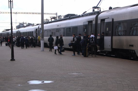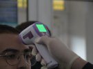 На Киевском вокзале приходит скоростной поезд Киев-Харьков. Пять человек довольно быстро направляют бесконтактные термометры на лица пассажиров и измеряют температуру на лбу. Люди не протестуют - выражают понимание, что этого требует ситуация. Однако, на дисплеях термометров температура слишком низкая - до 35 градусов.