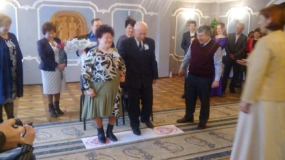 Обряд бриллиантовой свадьбы провели в местном ЗАГСе. Пучковы стали на свадебный рушник и приняли праздничный каравай. После официальной части мероприятия выпили шампанское и поцеловались.