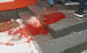 Активисты возмущены тем, что депутаты не явились на внеочередную сессию облсовета и облили красной краской лестницу в местном офисе партии БПП.
