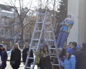 Участники становились на лестницу, читали фрагменты тематического стиха. Затем падали назад, где их подхватывали друзья. Это символизировало то, что нынешнее общество помнит активистов Майдана. В конце студенты исполнили народную песню "Плывут утята".