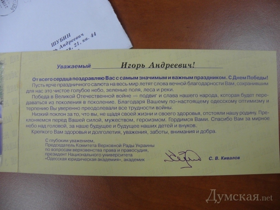 Очередной "поздравительный" скандал в Одессе. На днях семья участника Великой Отечественной войны Игоря Шубина получила поздравительную открытку от Одесской национальной юридической академии.