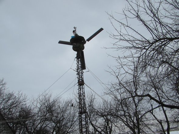 Добираюсь до поселка Супруновка. Расположен на окраине в 10 км с другой стороны Полтавы. Белая "девятка" подвозит ко двору 62-летнего Николая Пустовит. Он производит солнечную и ветровую электроэнергию для собственных нужд. Как раз вернулся домой. Нажимает кнопки кодового замка на металлическом заборе. Перед домом - высокий ветряк, установленный на металлической башне. Стальными тросами прикреплен к земле.