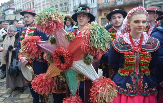 Коллективы из Польши, Чехии, Литвы и украинские этно-группы распевая колядки прошли шествием от городской шопки на площади Рынок в ярмарочной сцены на проспекте Свободы.