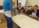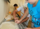 Вареники лепят со сладким и соленым сыром. В соленую начинку добавляют кусочки маслин. За полтора часа изготовили более 1200 вареников. Работу разделяют на всех. Кто-то раскатывает тесто, вырезает заготовки. Другие накладывают начинку и лепят вареники.