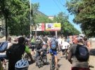В 11.07 колонна велосипедистов начинает ехать по бульвару Шевченко в сопровождении ГАИ. Идут в парк 50-летия советской власти - это почти семь с половиной километров. Колонна растягивается по дороге более чем на 600 метров. Позади нее со временем собирается большая пробка. Некоторые присоединяются к колонне по дороге.