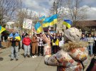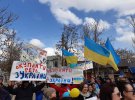 Люди с плакатами и государственными флагами пели гимн Украины, сообщает "Суспільне".