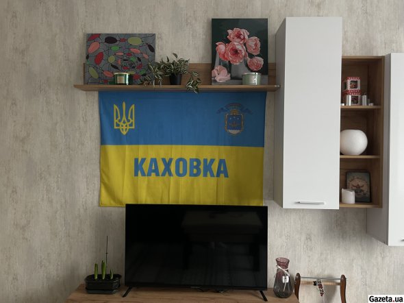 На полку поставили картины, икону, вазу и свечи. Ярко выделяется на стене большой украинский флаг, где синим по желтому напечатано: "КАХОВКА".
