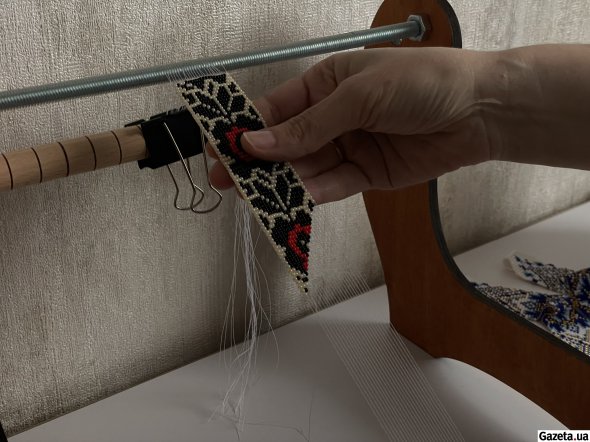 Ирина Михеенко живет в трехкомнатной квартире с мужем, сыном и дочерью. В сентябре 2022 года семья уехала из Каховки после долгих месяцев в оккупации. В гостиной под большим телевизором лежит голубовато-белый гердан из бисера. На станке для плетения Ирина работает над еще одним - с красными, черными и молочными бусинами.