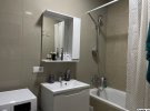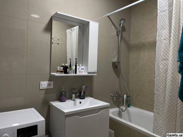 В туалете есть стиральная машина, мягкий коврик, большая ванна с душем за шторой, корзина для белья и вся необходимая мебель. Оксана садится на край дивана в гостиной и рассказывает, что начало полномасштабного вторжения пережили в Мариуполе.