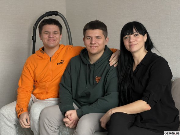 Поднимаемся по лестнице и стучимся в одну из квартир - открывает молодая стройная женщина с темными длинными волосами и выразительными глазами. Оксана Квашук родом из Мариуполя. За ее плечами стоят двое сыновей. 20-летние Владислав и Никита - близнецы, коренастые мужчины со смуглой кожей. Приглашают внутрь и сразу показывают дом.