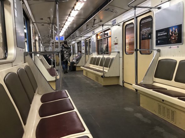 На платформах красной ветки пусто. Через громкоговорители пассажирам время от времени напоминают о правилах поведения в метро. В вагонах не более 20 человек в основном до 40 лет.