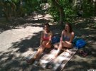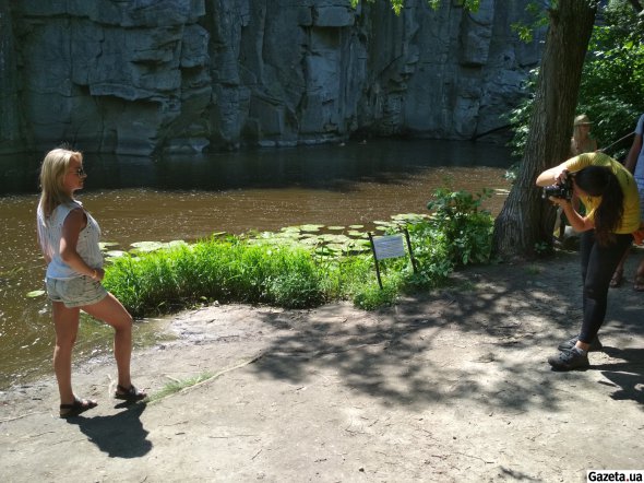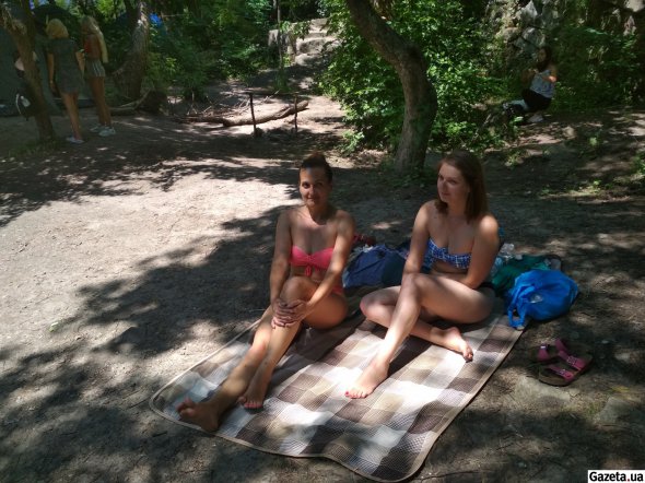 Возле лестницы к спуску в каньон оглядываются туристы из Киева. Наталья Явдошина вместе с сестрой Ириной загорают в купальниках у воды. Прячутся в тени деревьев, на солнце выставили только ноги.