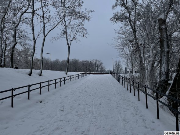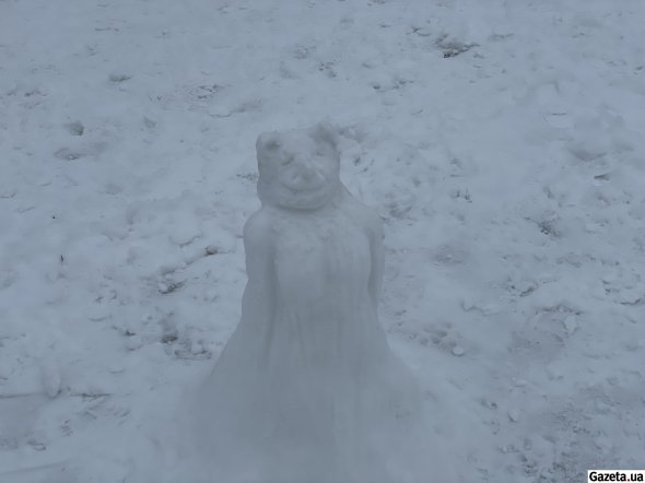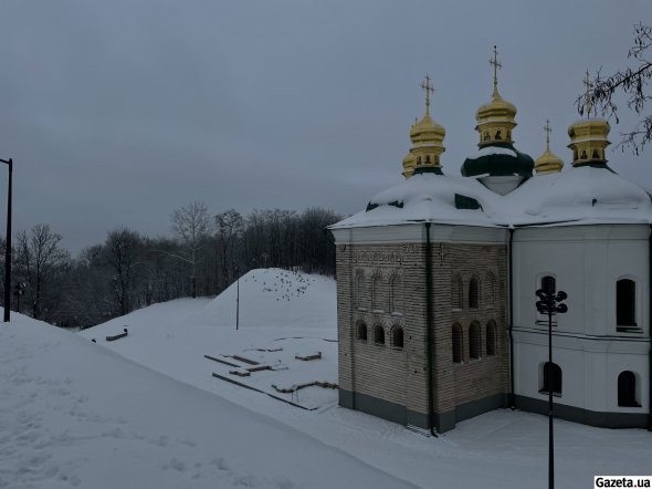 Зайти на территорию Лавры пробую с заднего входа. Вокруг многокупольной церкви Спаса на Берестове дорожки густо укрыл белый снег. Недалеко ребенок играет с мамой в снежки. За храмом кто-то слепил из снега фигуру медведя. Возле него проходит доставщик пиццы в поисках заказчика с большой термосумкой в руке.