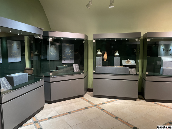 Среди экспонатов - украшения, пекторали и предметы оружия. Греческие колонисты, основавшие города-государства, оставили после себя керамические изделия, амфоры и архитектурные детали.