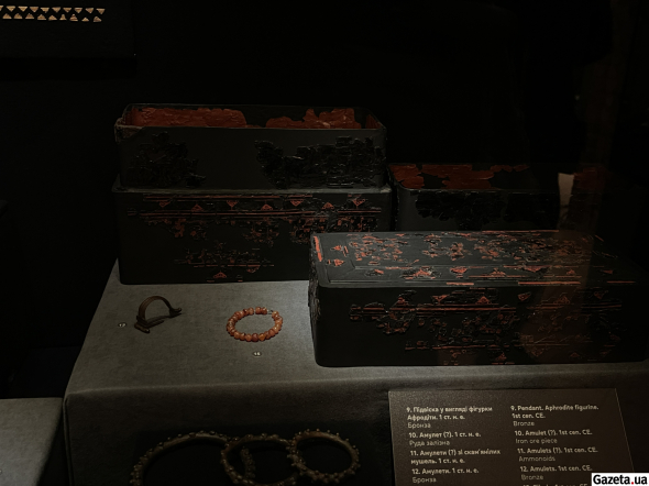 Особое место среди экспонатов занимают деревянные лакированные шкатулки, изготовленные в Китае: две трехсложные и одна двухсложная. Их обнаружили в западном Крыму. Предметы так хорошо сохранились, что можно рассмотреть узоры.