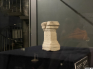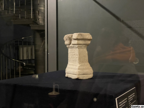 Куратор выставки показывает маленький мраморный алтарик. Его нашли при раскопках Херсонесского театра. В Причерноморье театры должны быть в каждом полисе, но остались только в Херсонесе. Это единственный театр, от которого остались столь значимые следы. Остальные были разобраны или разрушены.