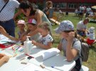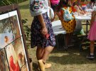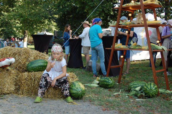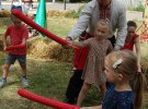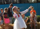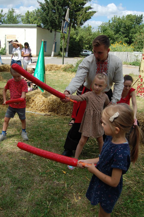 В центральной фотозоне висит баннер со стилизованным портретом Шевченко. Посетители фотографируются на его фоне. На поляне группа детей размахивает палками. Парни в шароварах и смушковых шапках показывают им, как орудовать искусственной саблей. С обеих сторон - круглая сцена, на которой начинается конкурс маленьких чтецов поэзии Шевченко.