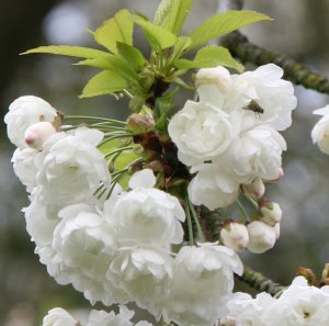 Куст вырастает высотой 2 м и 1,5 м в ширину. Ветки - темно-красные с белым махровым цветом, собранным в пучки. Когда закладываются бутоны, имеют розовый оттенок, а когда распустятся - белые. Цветет две-три недели в начале мая.