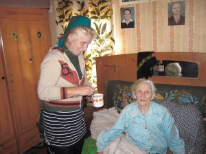 Приходит соседка Екатерина Супруненко. За ней соцработник Антонина Романова.