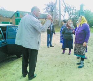 К полю на красной "ниве" подъезжает заместитель арендатора Сергей Ванжула. Крестьяне его обступают.