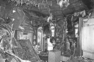 Около 4.00 человек в маске и белом маскировочном халате разбил стекло возле алтаря, забросил внутрь бутылку с зажигательной смесью, чиркнул спичкой и убежал.