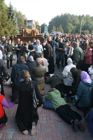 В 10.30 городской совет постановил демонтировать самовольно построенную часовню. С тех пор полсотни стражей порядка с коммунальщиками пытаются выполнить решение. Верующие бросаются под бульдозер и проклинают милицию.