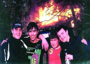 Четверо ребят из райцентра Звенигородка Черкасской области разместили в Интернете свои фотографии на фоне пожара. На снимке улыбаются 18-летние Александр Максименко, Сергей Кобылянский, Ярослав Алексеев и Владимир Олийник. Позади пылает помещение клуба рыбаков. К фото подпись: "Гори, гори ясно, чтобы не погасло".