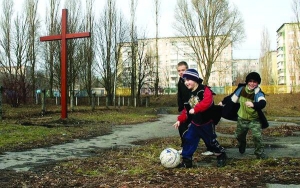 Показывает около своего дома заасфальтированную площадку с поломанными скамейками. Трое мальчишек гоняют мяч. На краю площадки установлен деревянный крест. На прошлых выходных его освятили греко-католические священники. Планируют построить здесь церковь.