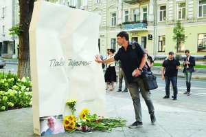 В годовщину смерти на месте гибели Шеремета на пересечении ул. Ивана Франко и Богдана Хмельницкого собрались несколько десятков человек. Пришли с цветами к памятнику, установленному год тому назад. К нему прикреплен фотопортрет погибшего с надписью "Политическое дело Павла Шеремета".