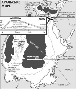 Впоследствии Аральское море высохло настолько, что разделилось на северное (в Казахстане) и южное (в Узбекистане). Позже из последнего образовались два - восточное и западное. Когда-то самый большой остров Возрождения превратился в полуостров.