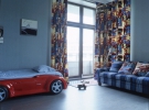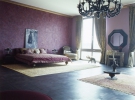 Спальная комната оформлена в фиолетовой гамме. Стену в изголовье кровати украшает рельефный узор пейсли. Контуры "огурцов" были выдавлены по сырой штукатурке, а потом вручную заполнены краской.