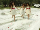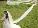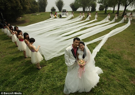 25-летняя невеста Ли Куо сделала свою свадьбу заметной, надев платье со шлейфом 520-метровой длины. Шлейф весит 50 килограммов, поэтому нести его Куо помогали аж 20 подружек невесты.