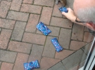 4 белки, которые живут в саду у дома, пришли по синие пакетики, в которые Пол положил орешки. Сам мужчина спрятался за стеклянными дверями в доме и наблюдал за животными. Белки сами раскрывали пакеты, доставали орешки.