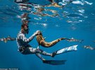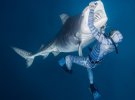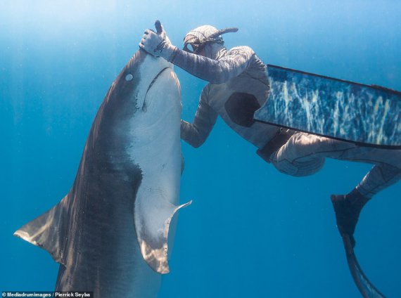 На кадрах видно, как 34-летний дайвер Пьеррик Сейбальд находится рядом с опасным хищником. Он подплывает к акуле и касается руками ее носа. Благодаря поглаживанием мужчине удается проводить руками по всему телу акулы.