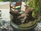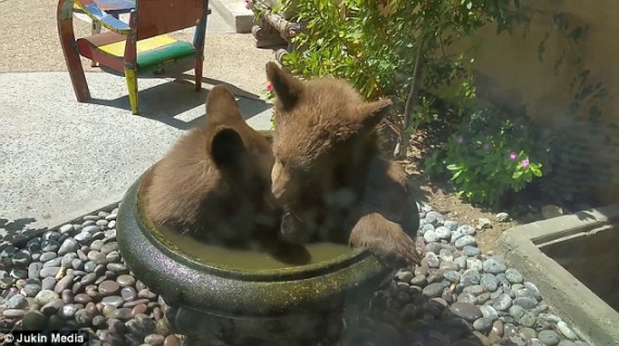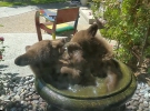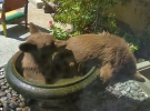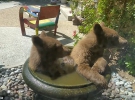 Пара отважных медвежат решила освежиться в поилке для птиц. Купание животных из окна заметил и сфотографировал владелец дома.