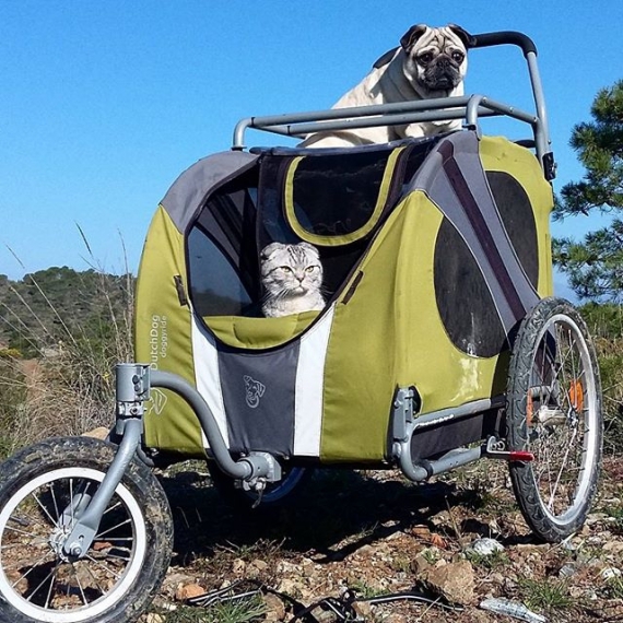 Забавная парочка животных-путешественников – мопс Бандито и кот Луиджи отправились в пеший поход по Испании вместе со своими хозяевами. Животные преодолели уже 1000 километров. За ними в Instagram наблюдают свыше 30 тысяч пользователей.