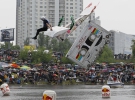 В итоге, победила команда под названием "Шевели ластами", которая свой ??"самолет" сделала из двух частей: "трамплина" на колесах и собственно самого летательного средства, которое, отделившись от нижней части, пролетело над водой больше других.