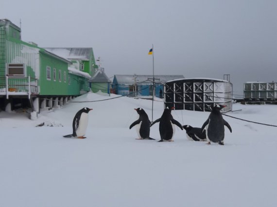 6 августа на станцию "Академик Вернадский" в Антарктиде неожиданно прибыли 5 пингвинов.