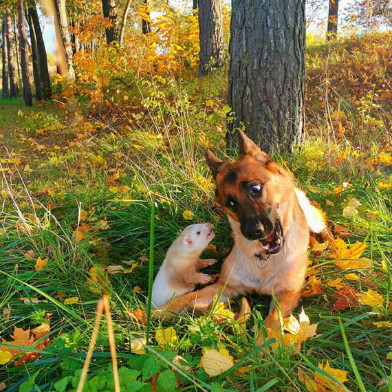 Как рассказала их хозяйка Диана Гриб, первой в ее доме появилась Нова. Взяла женщина овчарку щенком. Сразу принялась учить любимицу ладить с другими видами домашних животных, в частности с крысами, кошками и попугаями. Когда Нова подросла, Диана решилась осуществить еще одну свою мечту — завести хорька, пишет Bored Panda.